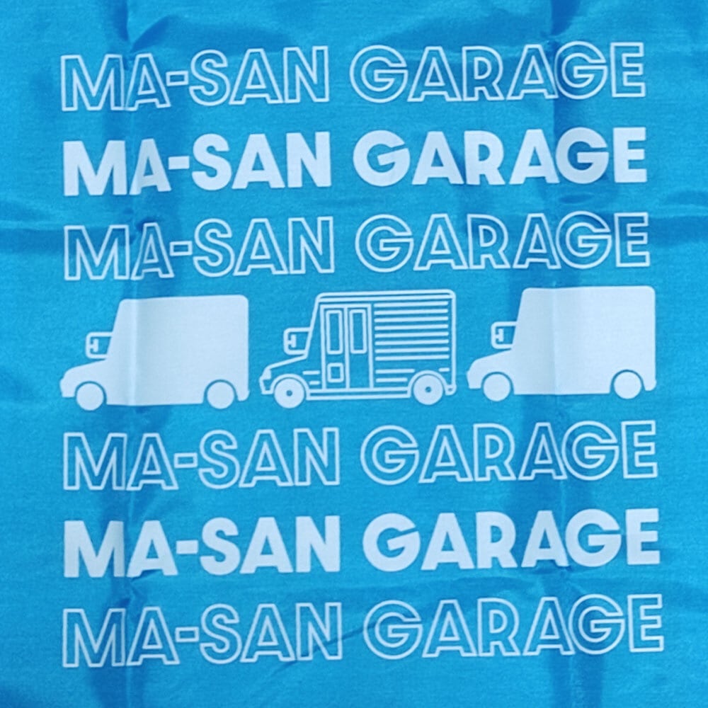 ミラウォークスルーバンのイラストと、まーさんガレージのロゴが大きくデザインされたエコバッグ。スタイリッシュなブラックカラーに映えるロゴが、日常の買い物をより楽しくしてくれます!